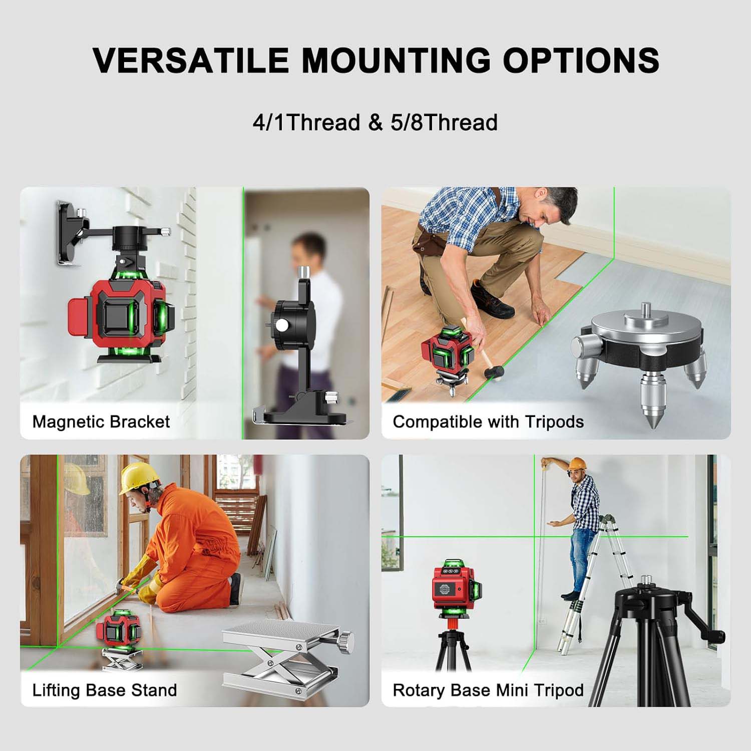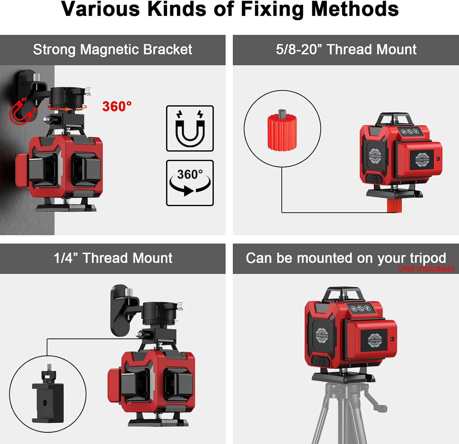 1. विविध फिक्सिंग विधियाँ:यह एक मजबूत चुंबकीय ब्रैकेट से सुसज्जित है, जो कई स्थितियों में लेजर स्तर को ठीक करने का एक स्थिर और सुविधाजनक तरीका प्रदान करता है। 5/8 - 20" थ्रेड माउंट इस प्रकार के थ्रेड के साथ विशिष्ट उपकरणों या संरचनाओं से कनेक्शन की अनुमति देता है। 1/4" थ्रेड माउंट माउंटिंग के लिए एक और विकल्प भी प्रदान करता है, जिससे विभिन्न सहायक उपकरणों के साथ इसकी अनुकूलता बढ़ जाती है।